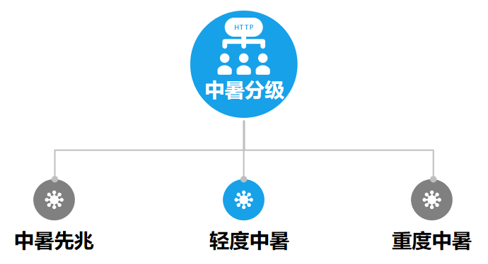 ①热射病,其特点是在高温环境中突然发病,体温高达40℃以上,疾病早期大量出汗,继之“无汗”,可伴有皮肤干热及不同程度的意识障碍等。②热痉挛,主要表现为明显的肌痉挛,伴有收缩痛。好发于活动较多的四肢肌肉及腹肌等,尤以腓肠肌为著。常呈对称性。时而发作,时而缓解。患者意识清,体温一般正常。③热衰竭,起病迅速,主要临床表现为头昏、头痛、多汗、口渴、恶心、呕吐,继而皮肤湿冷、血压下降、心律紊乱、轻度脱水,体温稍高或正常。