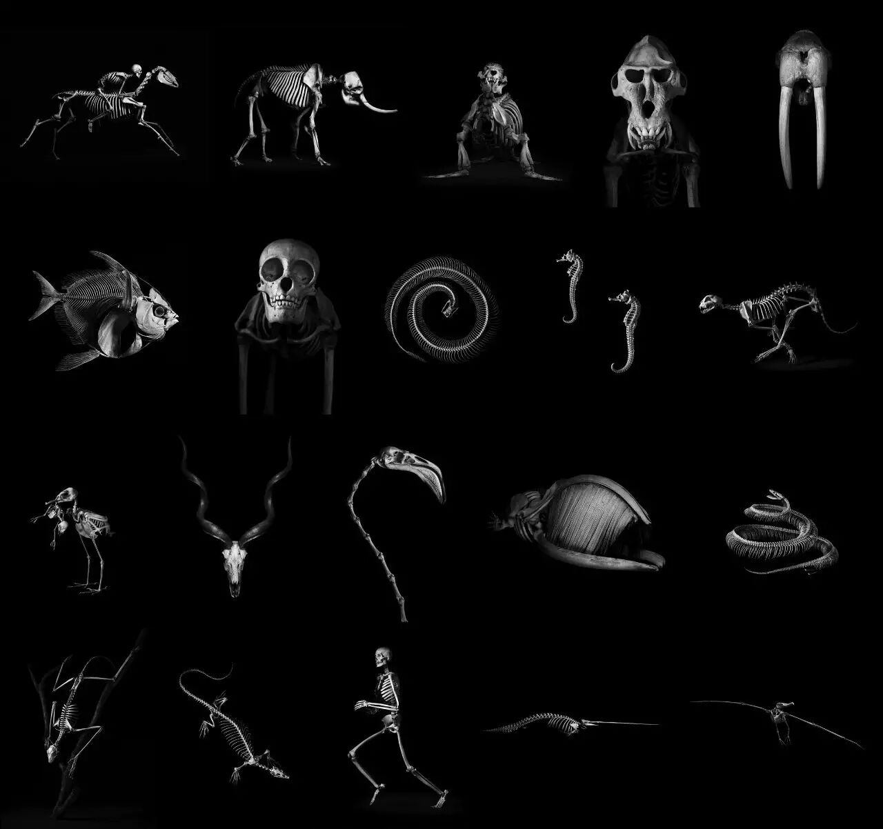 北冰洋(Arctic Ocean)游曳的独角鲸(Narwhal)、撒哈拉以南非洲(Sub-Saharan Africa)悠闲的长颈鹿(Giraffe)、豹子捕旋角羚(Leopard hunts addax)、金雕扑兔(Golden eagle swoops rabbit)……格里斯把这些骨骼拍活了。