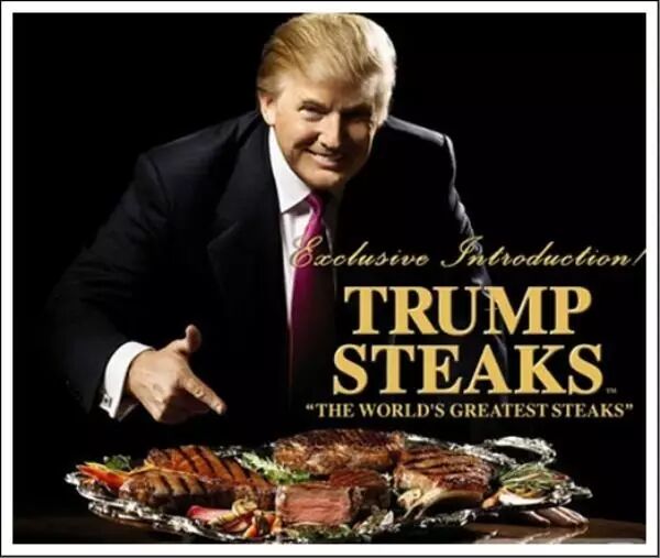 (川普创立了一个牛排品牌,经常推销自己的牛排,此前还有新闻爆出他吃全熟牛排震惊全美国人民……)
