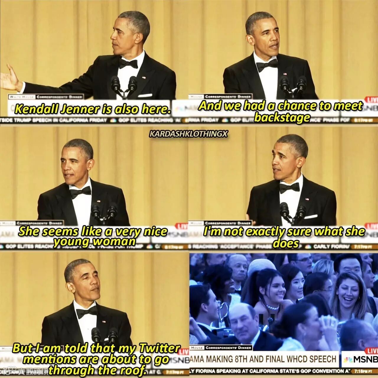 当晚到场的还有很多明星,奥巴马也不忘调侃一番。比如他点名了在座的一位高人气超模肯达尔·詹娜。