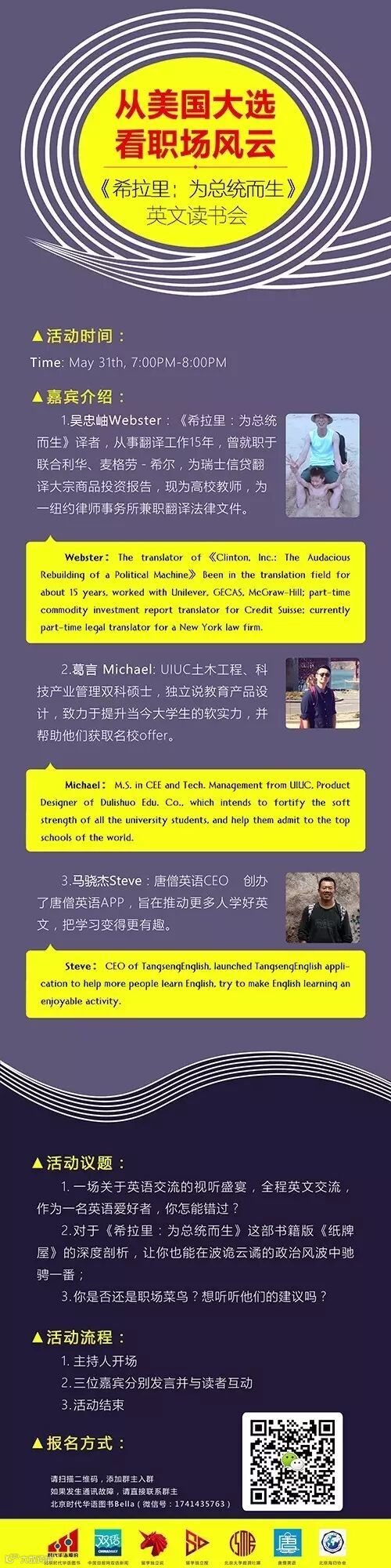 作为一个资深美剧迷没看过《纸牌屋》那你绝对out了!相信看过的同胞都对Francis和Claire这对因为共同的政治利益集结在一起的CP赞叹或鄙夷,更对里面波诡云谲的政治手段喟叹不已,那么现实中的美国政治又是怎样的呢?我们能从《希拉里》这本书中找到多少政治争夺的真实线索?5月31日我们邀你一起讲英语!从《希拉里:为总统而生》说起,看看这个女人在白宫的职场轨迹能够给我们带来哪些启示。纯英文演讲,纯英语交流,让你感受一场英语文化盛宴!她嫁给了总统,她还可能成为总统!让我们深入这位行将创造美国历史的女人的内心世界,了解她光环下的甘苦,怎样熬过全球最瞩目的小三事件,怎么从丑闻中逆袭成功,是怎样的心理修养让她在白宫这个职场江湖行走这么多年?