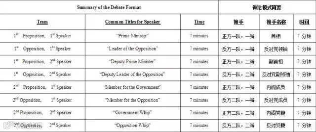 英国议会制辩论的比赛中,每场辩论由四队参加:正方两队,反方两队,各队独立准备,每队两名辩手。受英国议会制度影响,比赛正反方分别被称为“政府”(Government)和“反对党”(Opposition)。当然,各队辩手的称谓也极具“议会”特色。