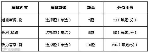 其余测试内容不变。调整后四级听力部分的试题结构见下表: