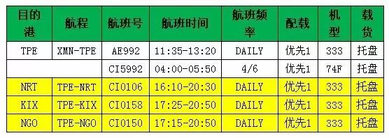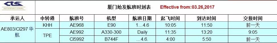 厦门直飞台北 AE992 机型A330-300 DAILY航班 ETD-ETA 11:35-13:20当天可接转NRT/KIX/NGO等港口