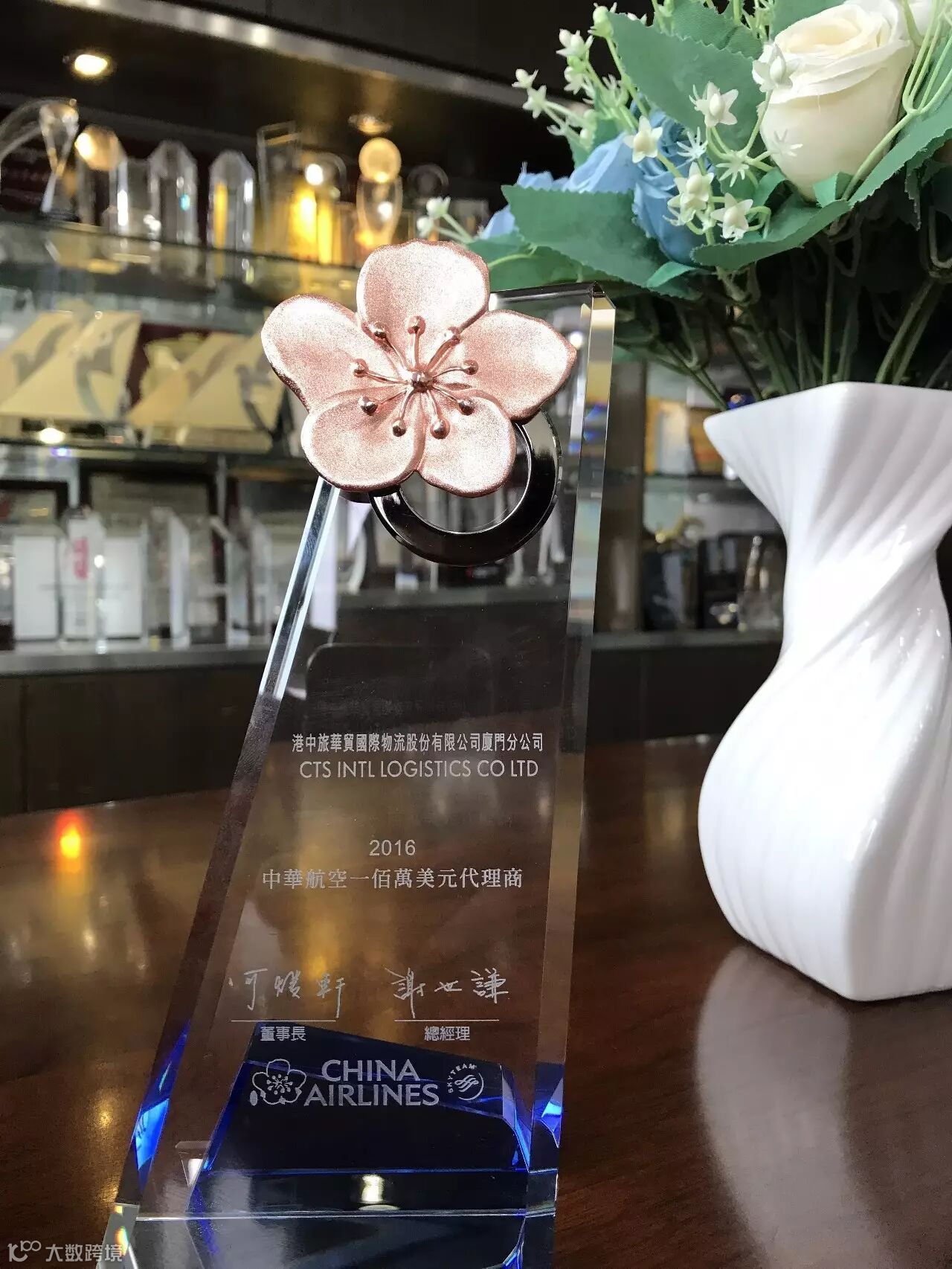 2017年5月15日中华航空授予我司“中华航空一百万美元代理商”(2016年度)。这是华航对核心货运代理颁发的重要奖项。