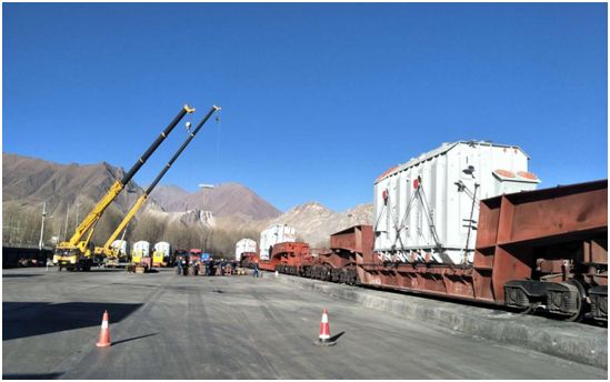 经过长途跋涉,我司 6 台大型牵引车翻越海拔五千余米的唐古拉山脉顺利抵达拉萨,12 月 12 日,雅中站第一批 3 台变压器经铁路运输到达拉萨西站,我司现场施工队员们克服不同程度的高原反应,稍事调整,随即投入紧张有序的接车准备工作中,根据预案有条不紊开展平板车对位、铁路自备车的拆捆绑、换装等作业。在强烈紫外线照射、大幅昼夜温差、缺氧干燥环境下,坚持以最高标准完成作业,使 7 米长的变压器其重心与平板车的装载中心横向偏差严格控制在 3 毫米以内,绑架加固由往常 8 个点绑扎增加至 12 个点绑扎,确保每一项措施、每一道安全保障万无一失。