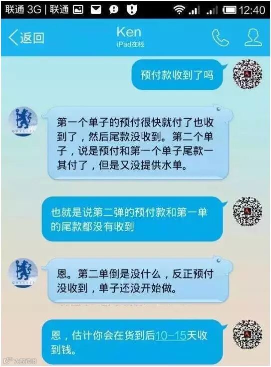 之后过了4天,Ken和我报喜,说顺利收到第一批货的尾款和第二批货的预付。并且客户在19号来国内,一起去Ken的合作工厂考察了下。