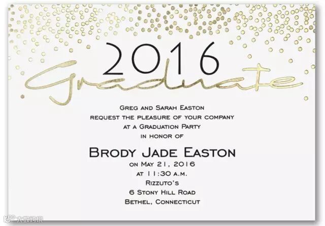 美国不少家庭也会in honor of 毕业生而举办graduation dinner/party,向亲友发出invitations。
