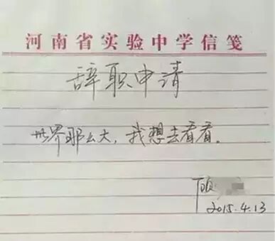 2015年4月14日,一名河南女教师的辞职信引发热评,辞职的理由仅有10个字:“世界那么大,我想去看看”,网友热评这是“史上最具情怀的辞职信,没有之一”,仅一天时间微博转发多达6000余次,评论超过1700条。