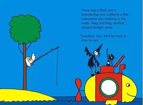 There was a flash and a thunderclap and suddenly a little submarine was bobbing in the water. Meg and Mog climbed aboard straight away.