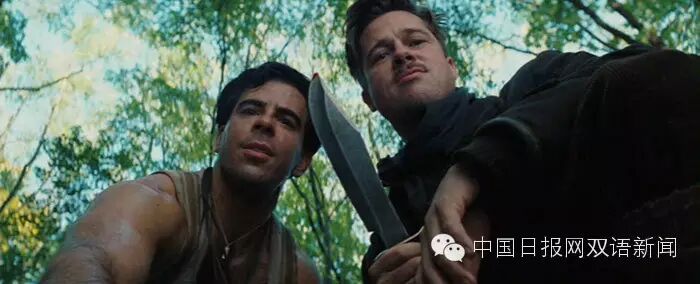 ↑这是昆汀的经典作品《无耻混蛋》中的一幕,视角来自躺在地上的一个纳粹,皮特刚刚用那把刀在他头上刻了一个纳粹标志。