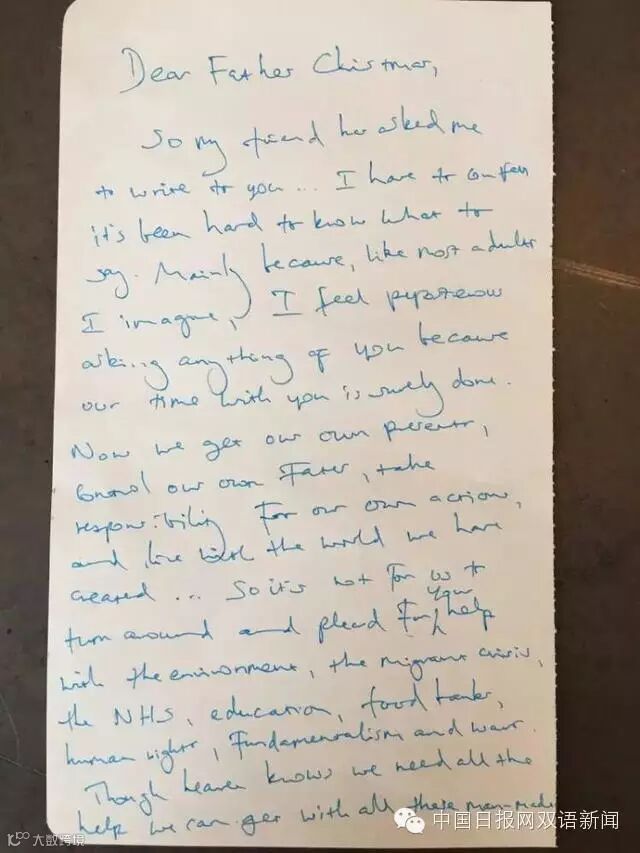 我的朋友叫我写信给你……我不得不承认实在很难知道该对你说什么。主要是因为像大部分成年人一样,我觉得对你要求点什么好像很荒谬,因为我们和你已经没有交集了。现在的我们自己给自己买礼物,掌握自己的命运,对自己的行为负责,并且生活在我们自己的创造的世界里面……所以我们没有理由找你帮忙来解决我们自己所造成的那些问题,比如环境问题、移民危机、NHS医保系统、教育、食物银行、人权、原教旨主义和战争。尽管天晓得,我们真的需要任何能得到的帮助来面对这些人造的危机和麻烦。