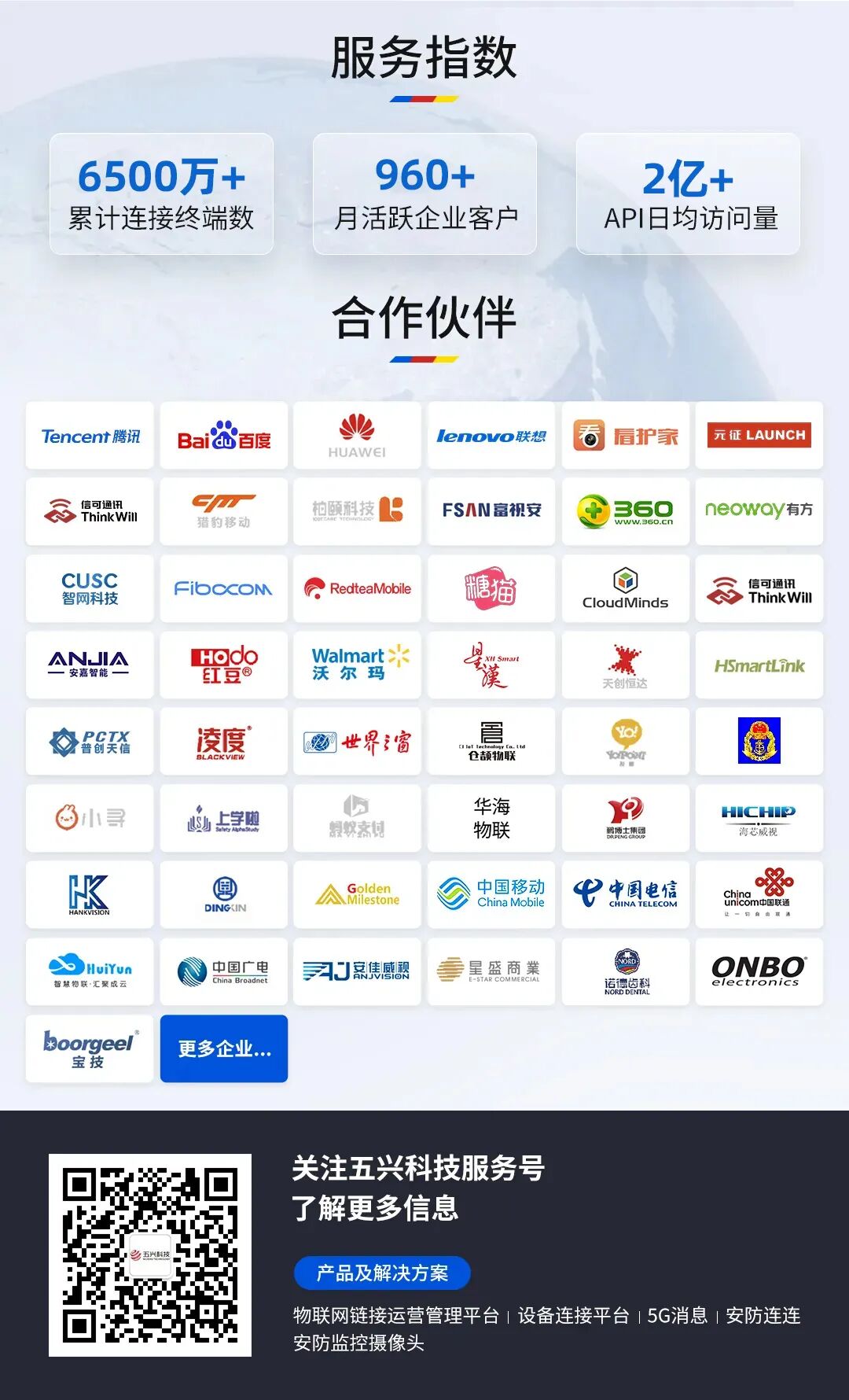 五兴科技,国家级高新技术企业、国家企业信用评价AAA级企业、中国联通战略合作伙伴、中国电信天翼物联优秀生态合作伙伴、深圳市智慧安防商会副会长单位、九脉杯优秀SaaS方案商......拥有二十余项国家软件著作登记证书,是全球领先的物联网和云通信解决方案服务商。五兴科技始终秉承“五兴科技,五星服务;五兴科技,国家兴旺”的使命,业务聚焦于5G消息、智能物联网和视频安防服务,平台赋能共生构建开放合作生态,推动助力企业生态数字化转型。