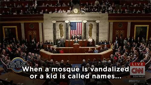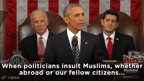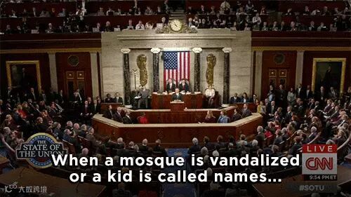 有的政治家侮辱穆斯林,有人肆意破坏清真寺,有孩童受到欺辱……这些都不会让我们的国家更安全。我们美国人不应该是这样的人。这种做法大错特错。它贬低了我们在世界眼中的形象,让我们更难达成目标。而且它背离了美国的国家本质。