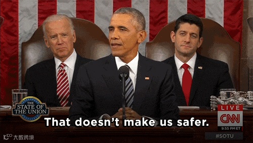奥巴马把当晚最严厉的抨击之一指向了共和党总统参选人特朗普(Donald Trump)“川普”。针对川普曾声称应拒绝所有穆斯林进入美国等歧视穆斯林的言论,他说——