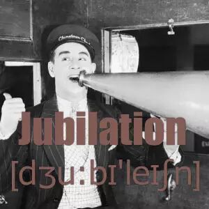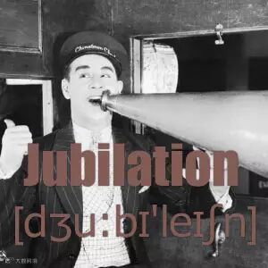 Jubilation是快乐的感觉,或喜悦的欢呼,或庆祝活动。这个词于14世纪末进入英语,来源于拉丁语,意为“欢乐地大喊”。这个词因为民谣摇滚双人组合“西蒙和嘎芬寇尔”的那首《Cecilia》而成为不朽,里面的歌词唱道:“Jubilation! She loves me again; I fall on the floor and I’m laughing.”