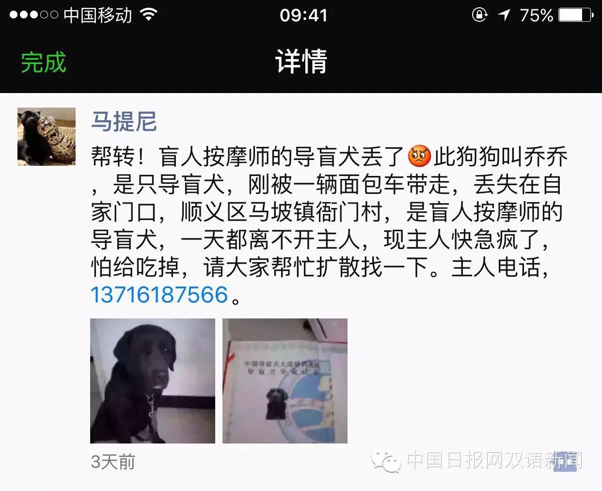 22日8点左右,“乔乔”在陪主人田凤波出门遛弯时,在北京市顺义区被一面包车掳走(stolen and taken away in avan)。