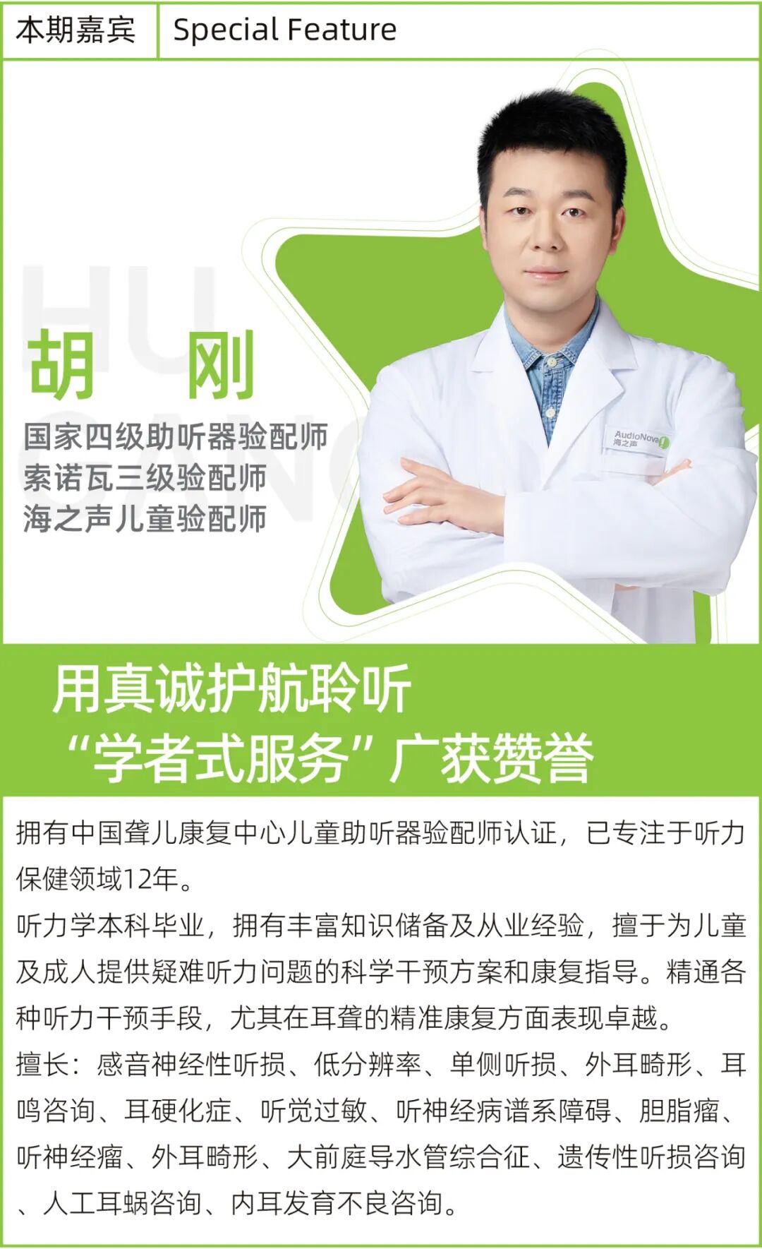 他,就是胡刚老师,AudioNova海之声的资深听力专家。他的平凡日常,是专业与使命的完美融合,更是听损患者们重获新“声”的有力见证,今天,就让我们一起来聆听他的故事。