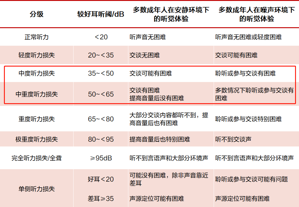 对照上面的表格可以看出,与人沟通时有困难,需要提高音量才能正常聆听交谈,并不是通常认为的“只有一点点耳背”,此时的听力损失很有可能已经达到中度甚至中重度。