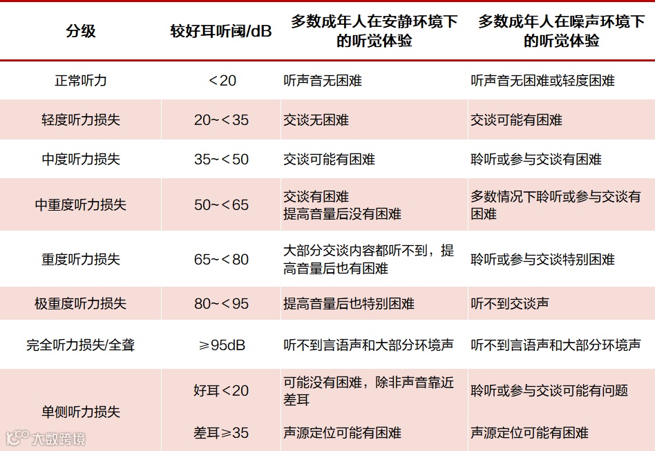 世卫组织(WHO)从正常听力到完全听力损失/全聋,根据不同的严重程度进行了等级划分。