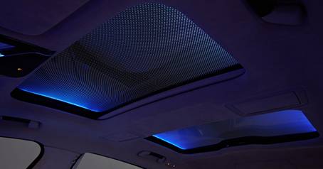 The Panorama glass roof Sky Lounge is optional in the all-new BMW 7 Series. It produces a unique and luxurious ambience by night with innovative illumination effects on its large glass panels. These lights provide an extraordinary atmosphere due to the panel’s exclusive pattern, which consists of engraved elements that become gently illuminated in the six different colors of the ambient light package.