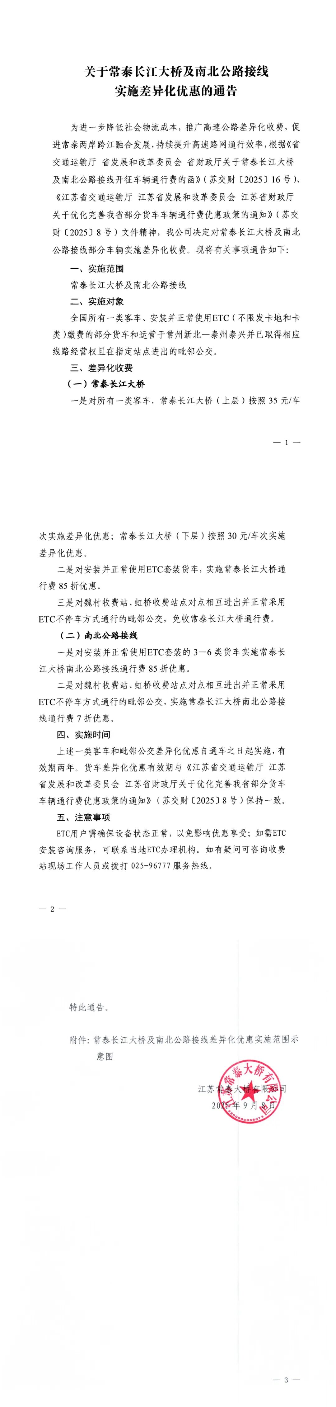 关于常泰长江大桥及南北公路接线实施差异化优惠的通告