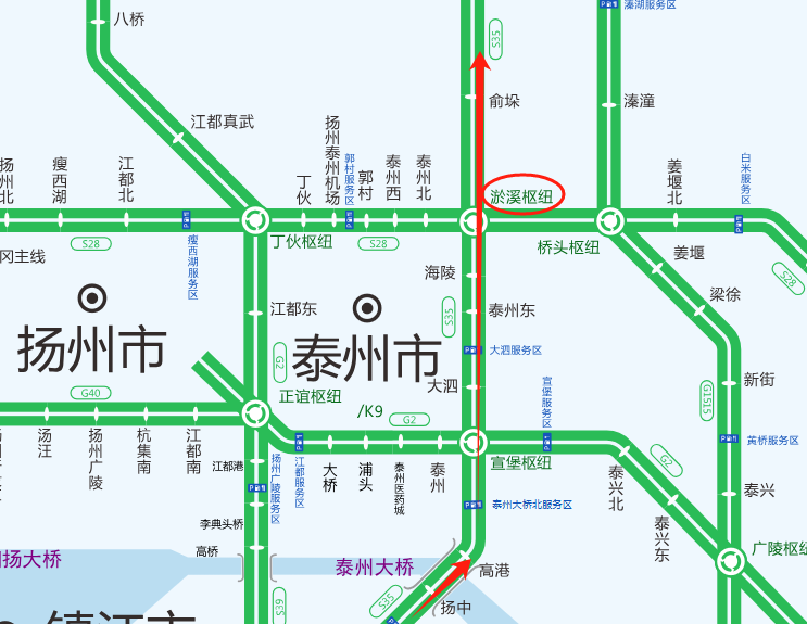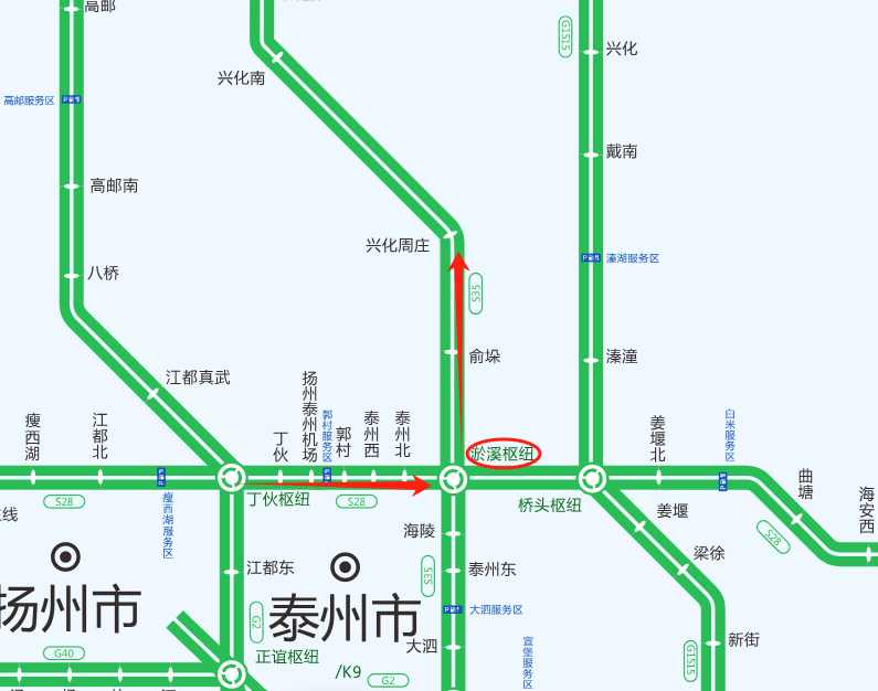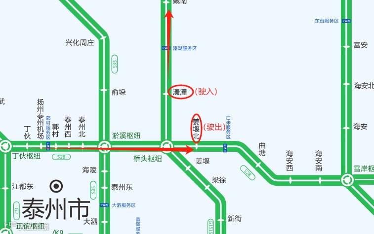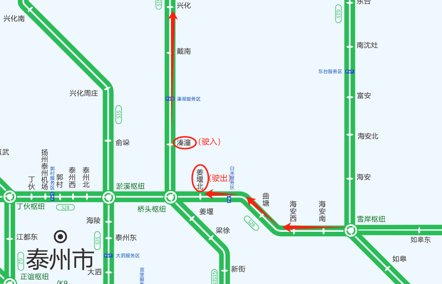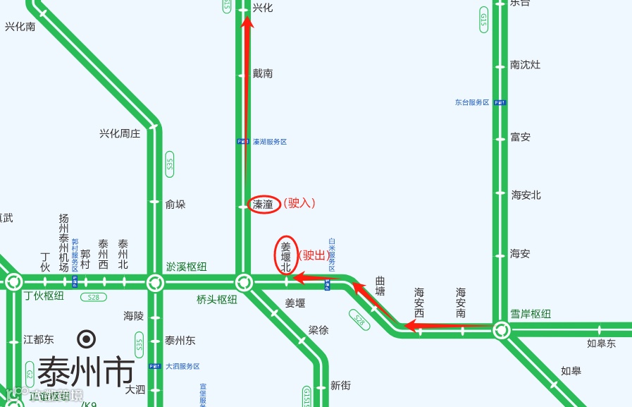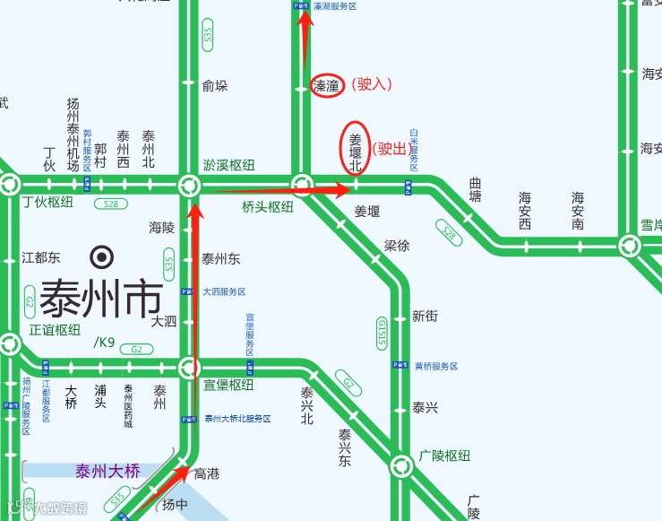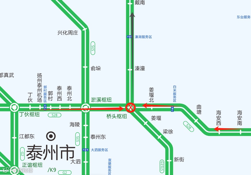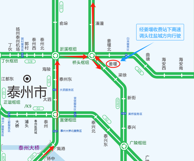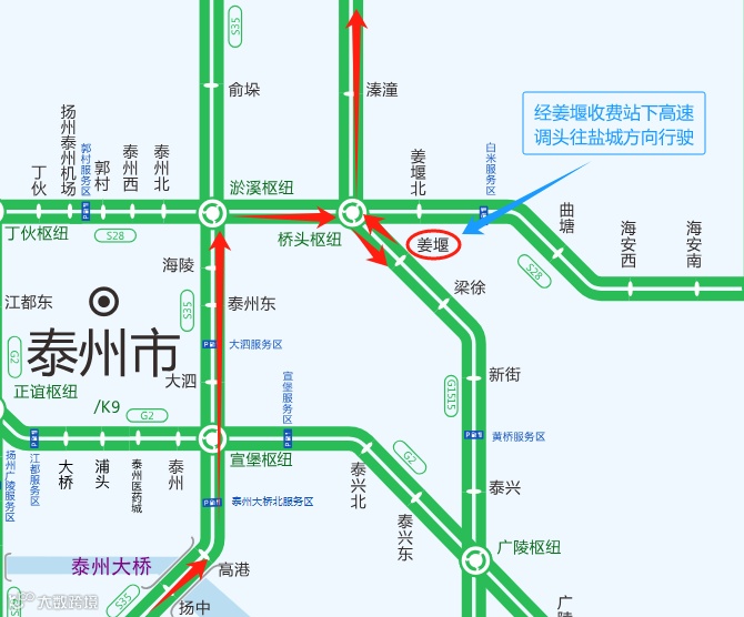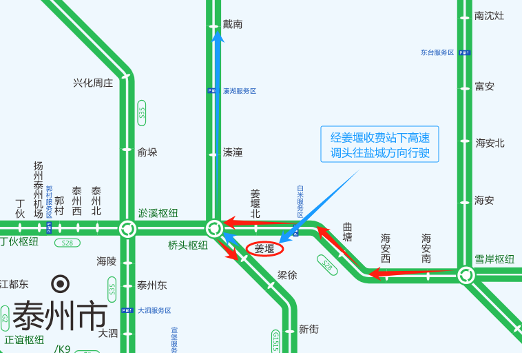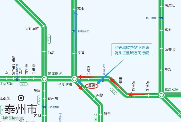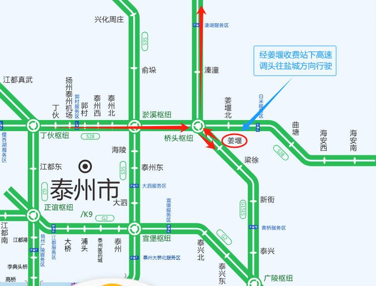 2.车辆可以通过桥头枢纽在姜堰北收费站下高速,经S610绕行至溱潼收费站上高速;