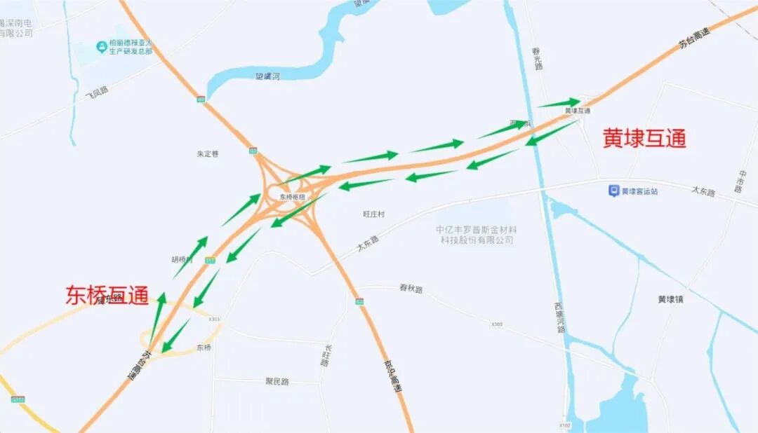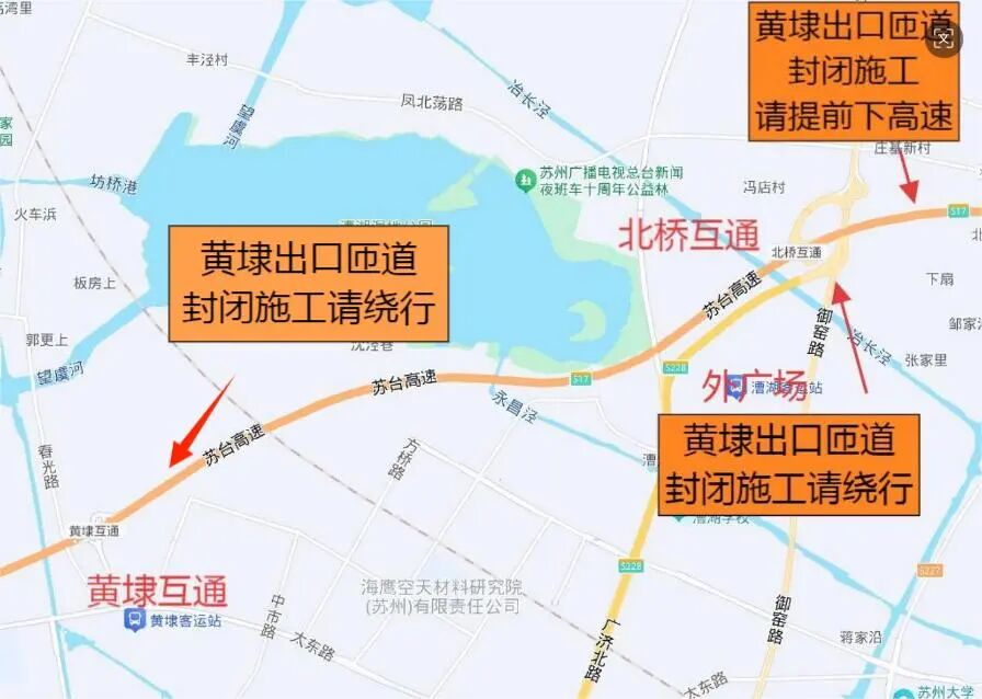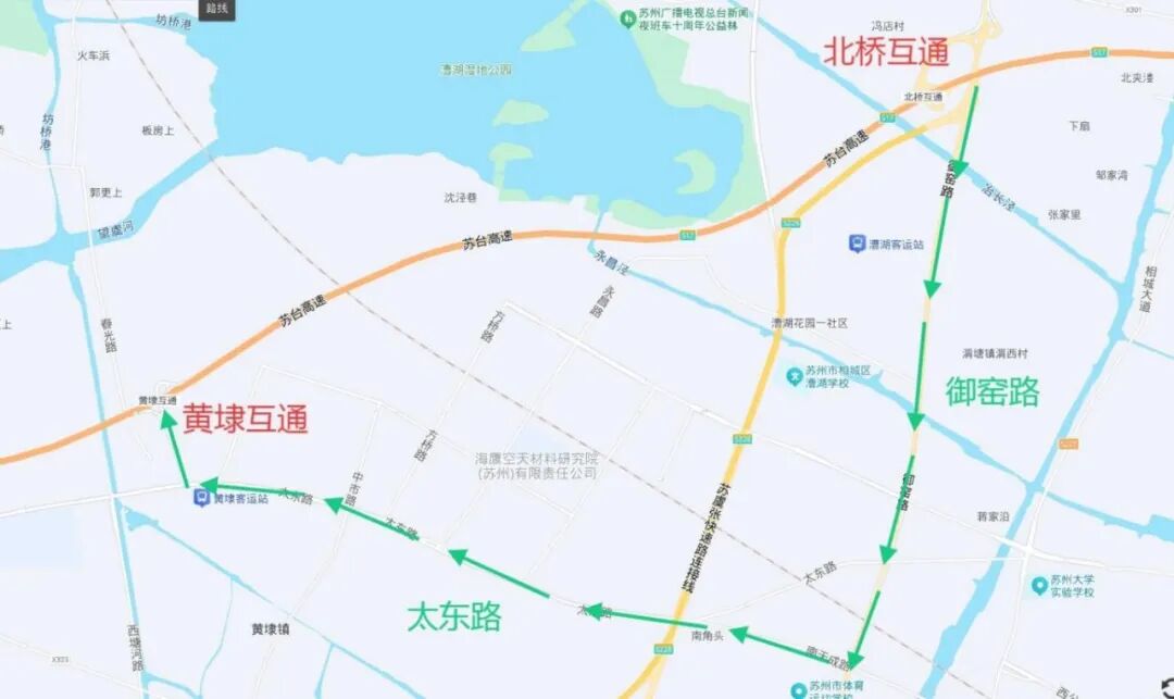 苏台方向的司乘人员,可选择从北桥互通提前下高速,走地面御窑路,经太东路至黄埭互通;
