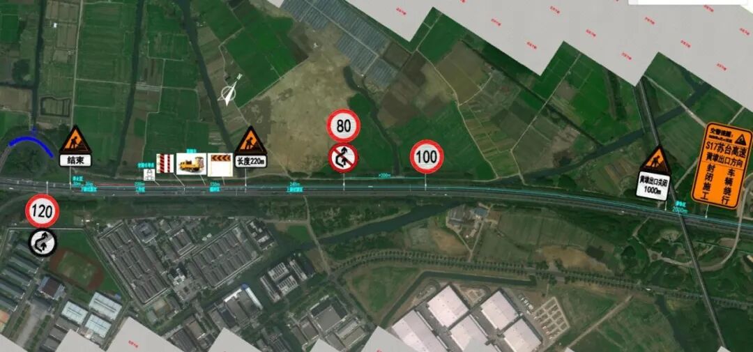 北桥互通上游放置“黄埭出口匝道封闭施工请提前下高速”指示牌;