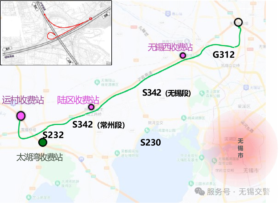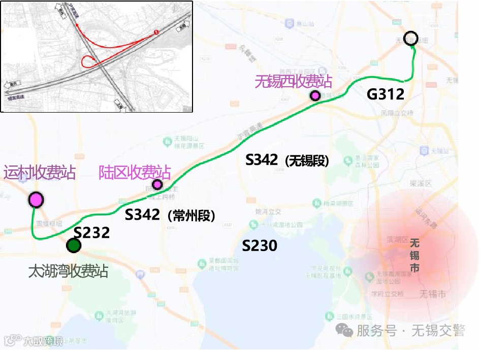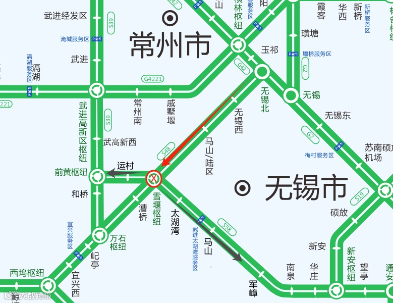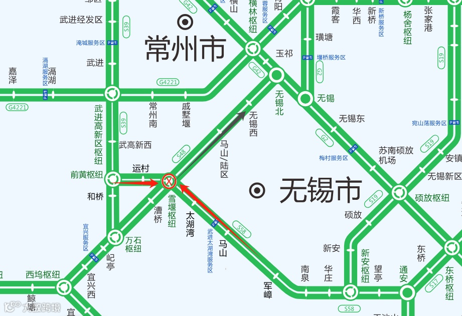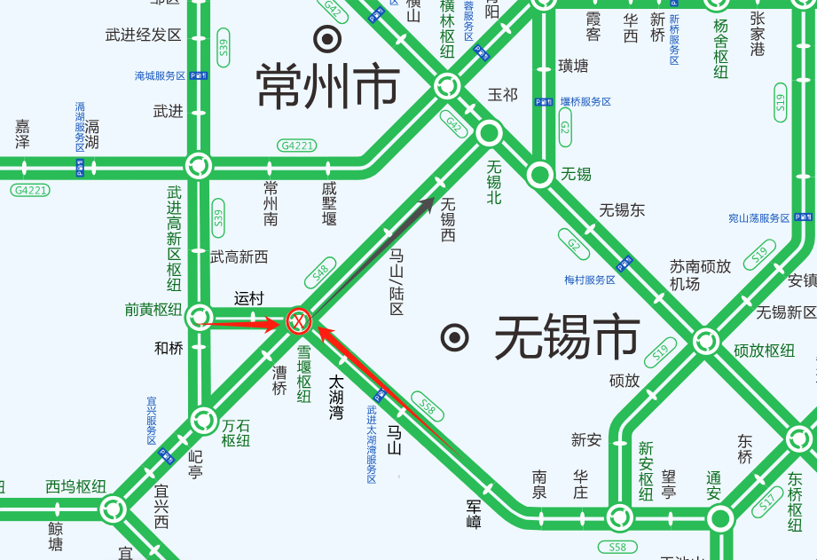 S48锡宜高速无锡方向来车转S58沪常高速常州、苏州方向: