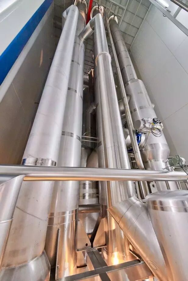 这些底部纵横交错的管子,给人种高大上的工业怪兽的感觉。它们每小时的蒸发量高达十几吨。牛奶变成奶粉的关键一步正是在这里进行——蒸发掉其中的水分,进行浓缩。