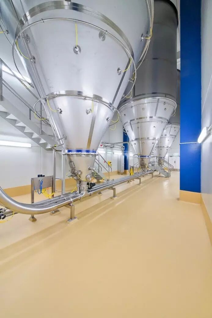 一路跌跌撞撞摸进工厂灵魂重地,各色管子、转盘、按钮……每个小小的机关都掌管着奶粉的命运!So,这里是工厂最复杂最神奇的所在之一,干燥塔!别误会,干燥塔高达四五十米,这里只是塔顶。正是通过这些神秘的机关,牛奶将转化为真正的奶粉。