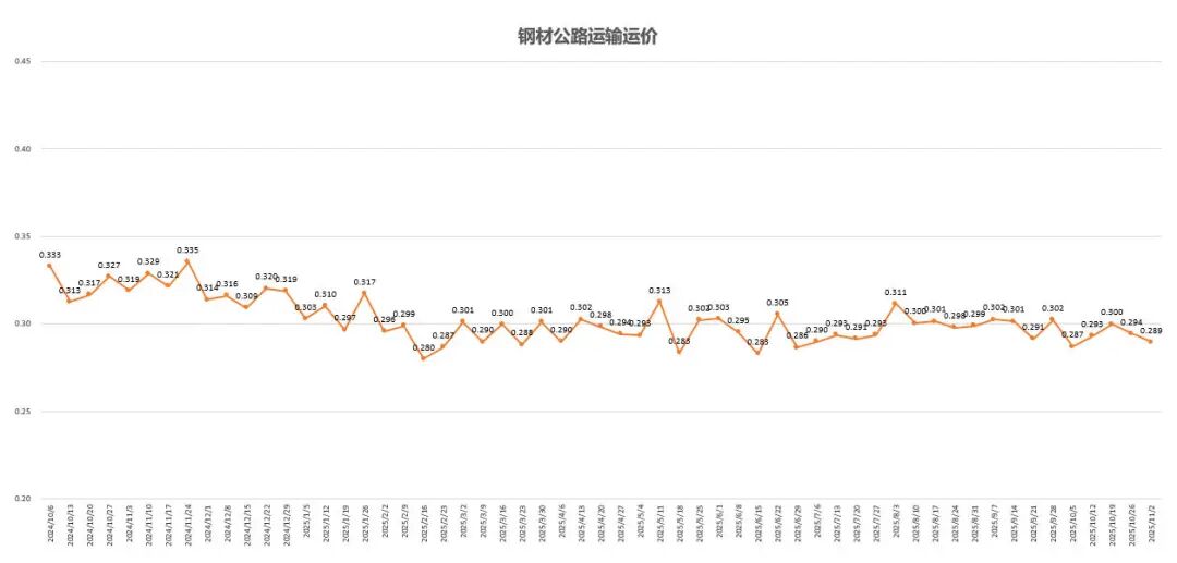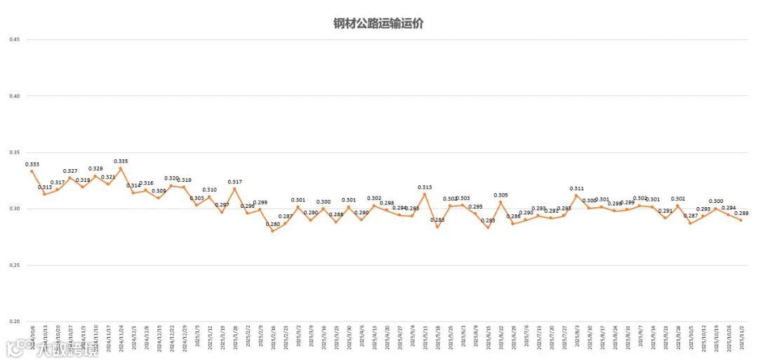 本周钢材运输运价为0.289元/吨公里,较上周下跌了0.005元/吨公里,跌幅为1.70%。