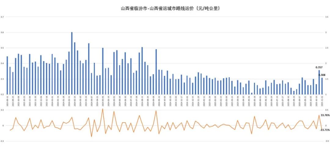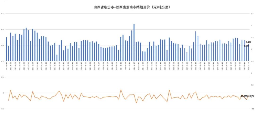 本周临汾至渭南干线周平均价为38.81元/吨,按公里数折算为0.307元/吨公里,上涨3.54%。