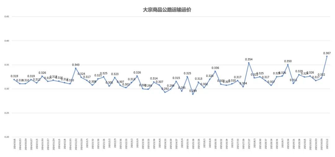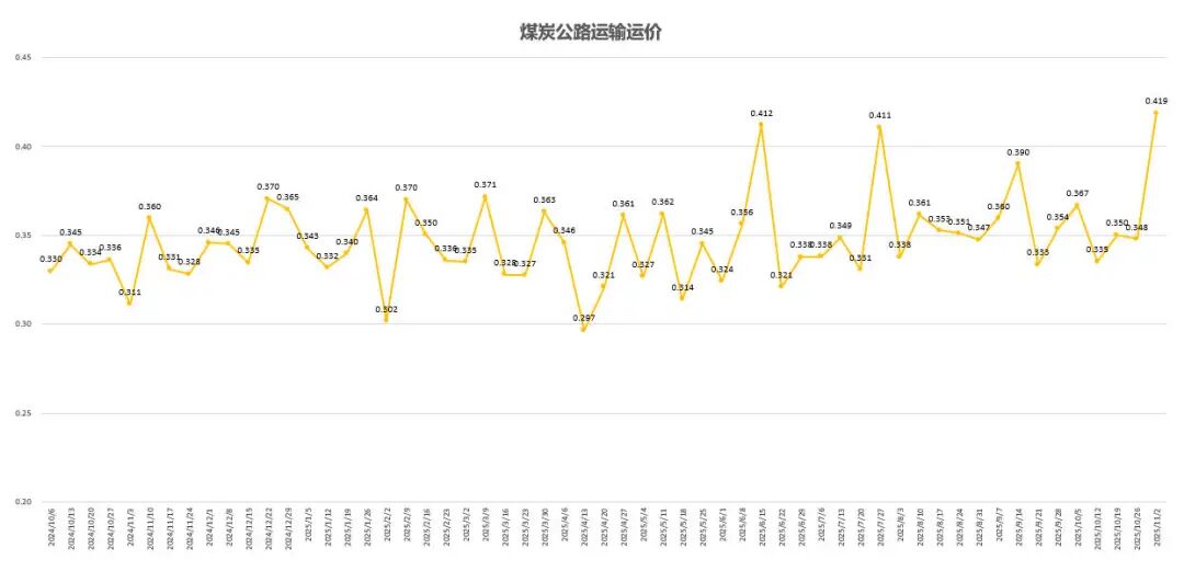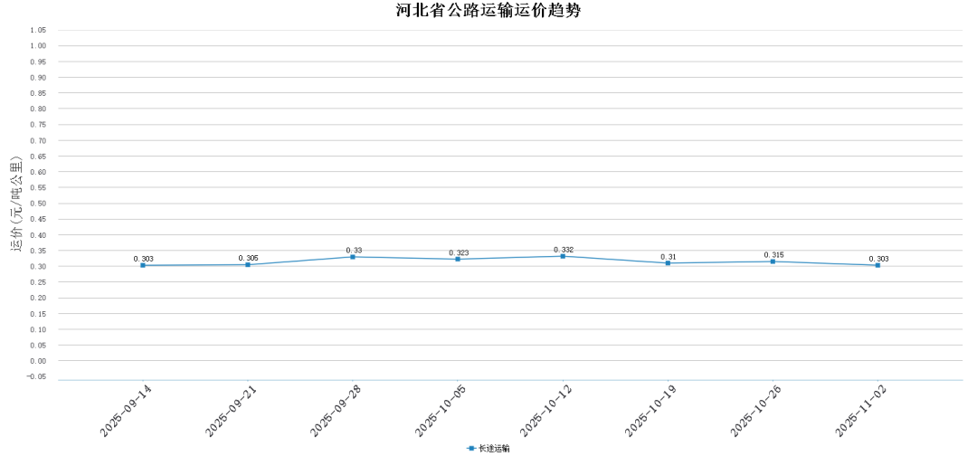 本周山西公路运输运价为0.303元/吨公里,较上周下跌了0.012元/吨公里,跌幅为3.81%。