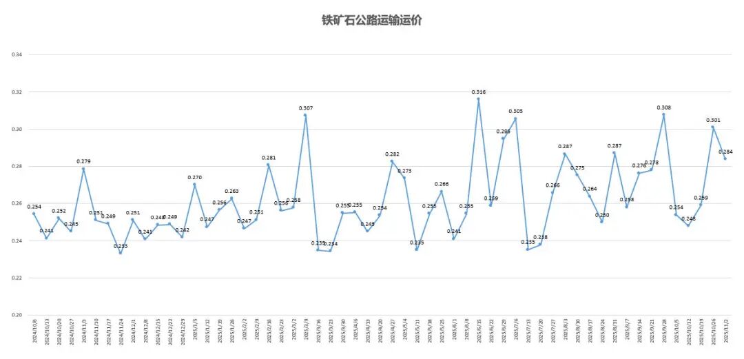 本周铁矿石价格区间震荡。供应方面,海外发运量波动较大,巴西发运虽相对稳定,而澳大利亚发运量显著下滑,铁矿石发运明显回落。需求方面,终端需求旺季结束,钢厂盈利水平持续收缩,叠加河北地区环保限产政策加码,对铁矿石刚需补库为主,汽运市场整体偏冷淡。故本周铁矿石运输运价下跌。