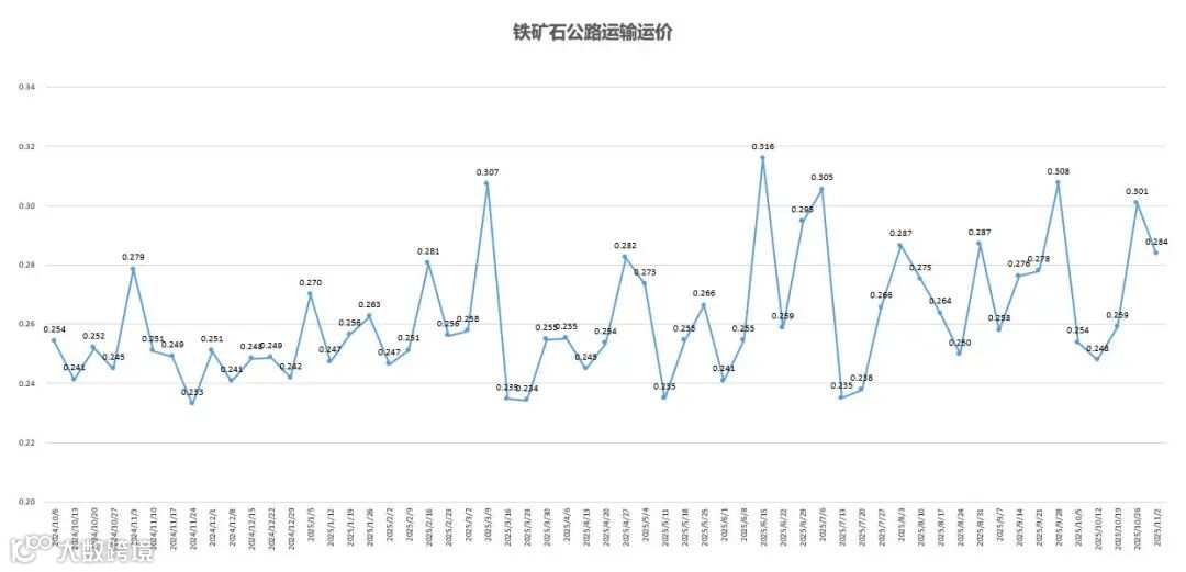 本周铁矿石运输运价为0.284元/吨公里,较上周下跌了0.017元/吨公里,跌幅为5.65%。