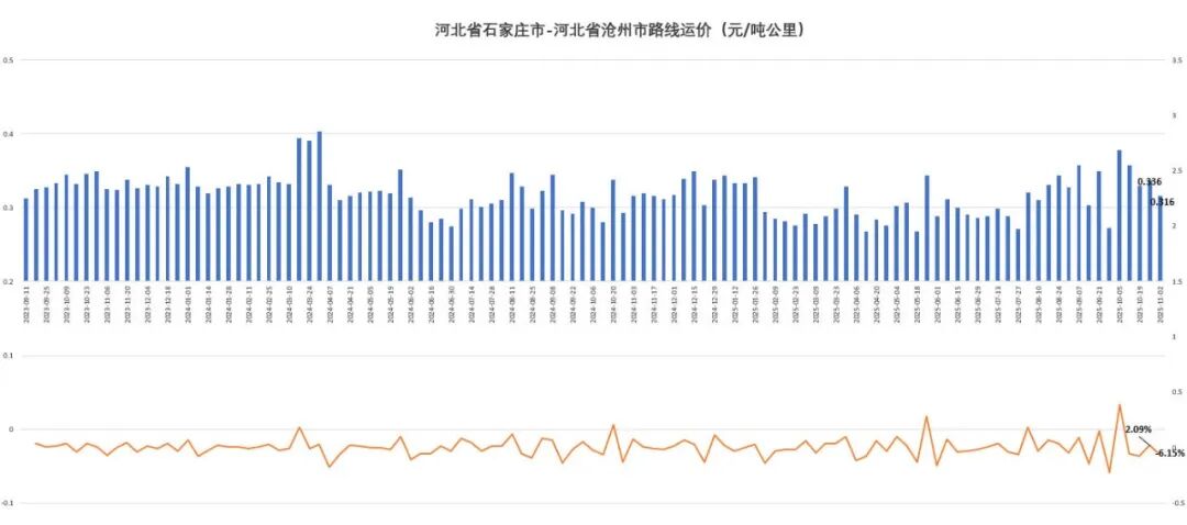 本周石家庄至沧州干线周平均价为51.8元/吨,按公里数折算为0.316元/吨公里,下跌6.15%。