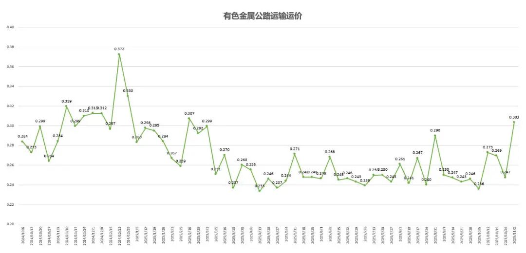 本周有色金属运输运价为0.303元/吨公里,较上周上涨了0.056元/吨公里,涨幅为12.67% 。