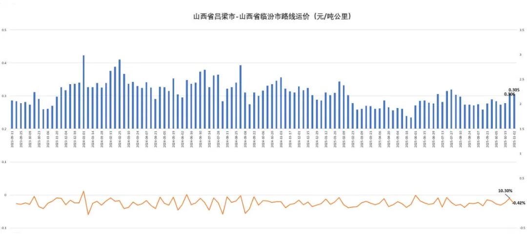 本周吕梁至临汾干线周平均价为71.23元/吨,按公里数折算为0.305元/吨公里,下跌0.42%。