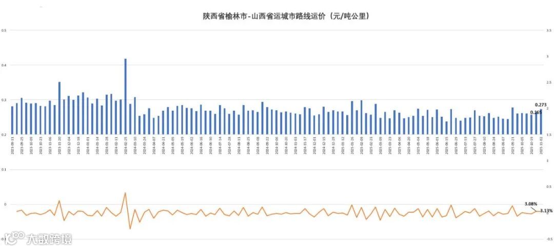 本周榆林至运城干线周平均价为122.72元/吨,按公里数折算为0.273元/吨公里,下跌3.13%。