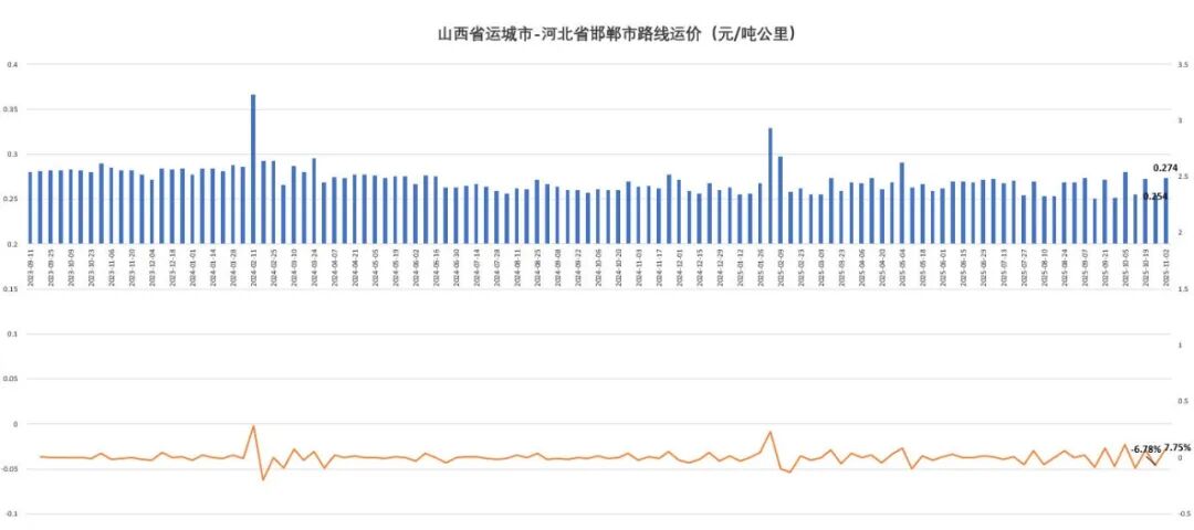 本周运城至邯郸干线周平均价为107.47元/吨,按公里数折算为0.274元/吨公里,上涨7.75%。