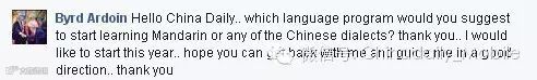 1. Byrd Ardoin: Hello China Daily.. which language program would you suggest to start learning Mandarin or any of the Chinese dialects? thank you.. I would like to start this year.. hope you can get back with me and guide me in a good direction.. thank you!