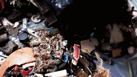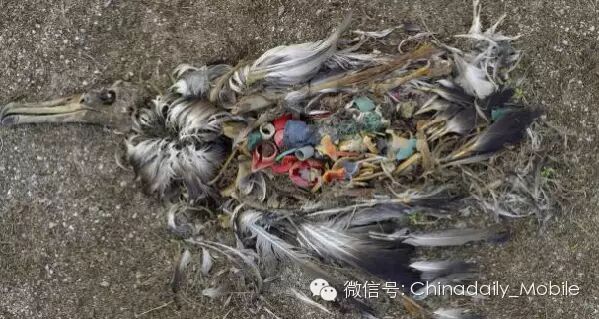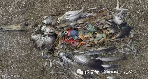 下图是一只死掉的信天翁。它的肚子里,全是触目惊心的塑料垃圾。