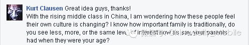 在中国,中产阶级快速发展,这个群体面对他们随之而变化的文化的感受是什么?传统上讲,我知道家庭是多么重要,如此所说,你看到人们对家庭的重视程度跟你父母在你们这个年纪的时候有什么变化?更多?更少?或者是一样的?