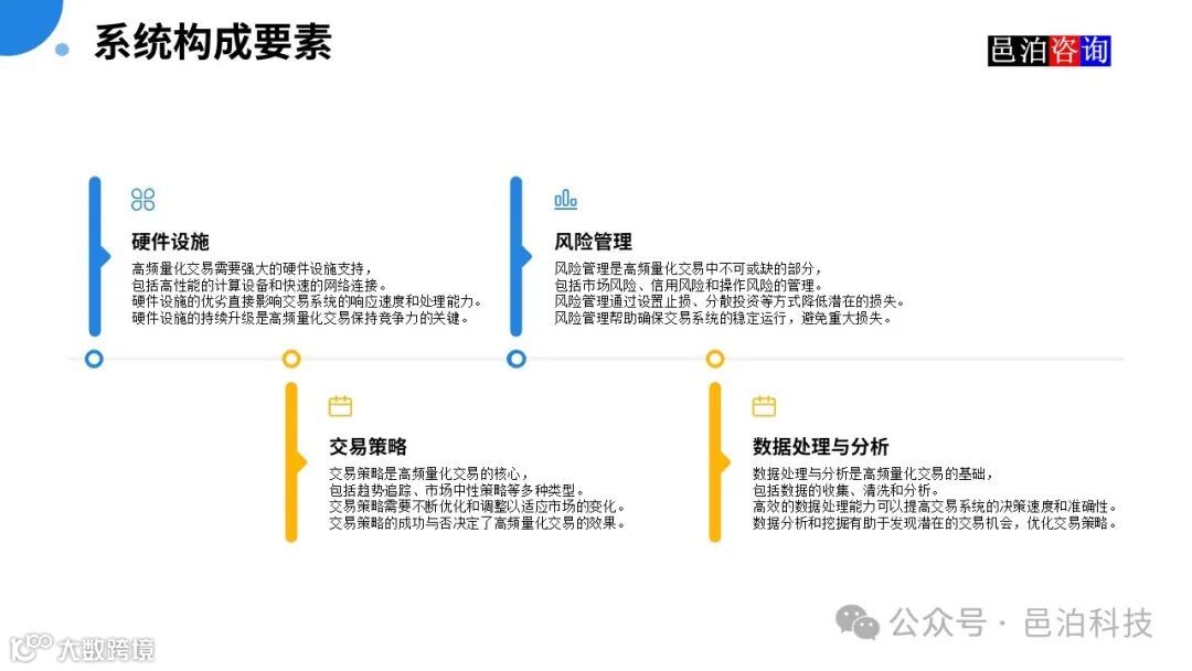 高频量化程序化交易系统系统构成要素包括:硬件设施、风险管理、交易策略、数据处理与分析。