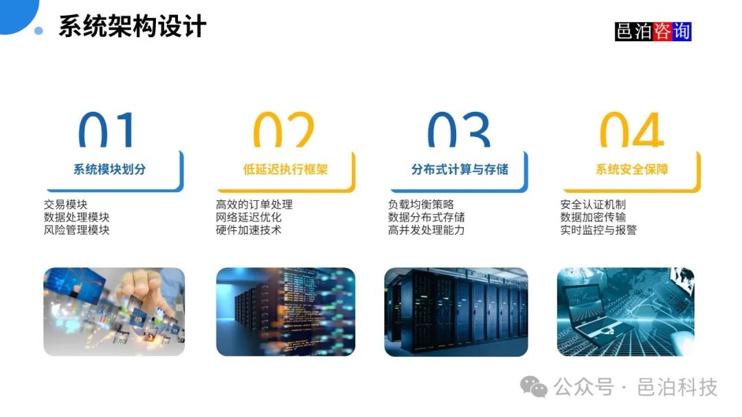 高频量化程序化交易系统系统架构设计包括:系统模块划分、低延迟执行框架、分布式计算与存储、系统安全保障。