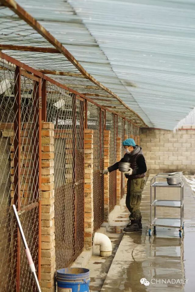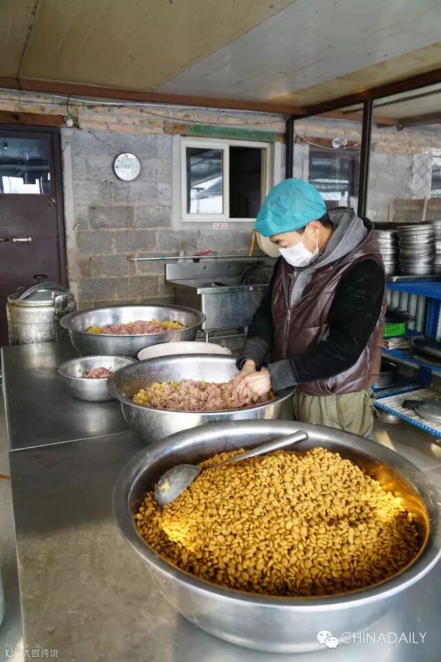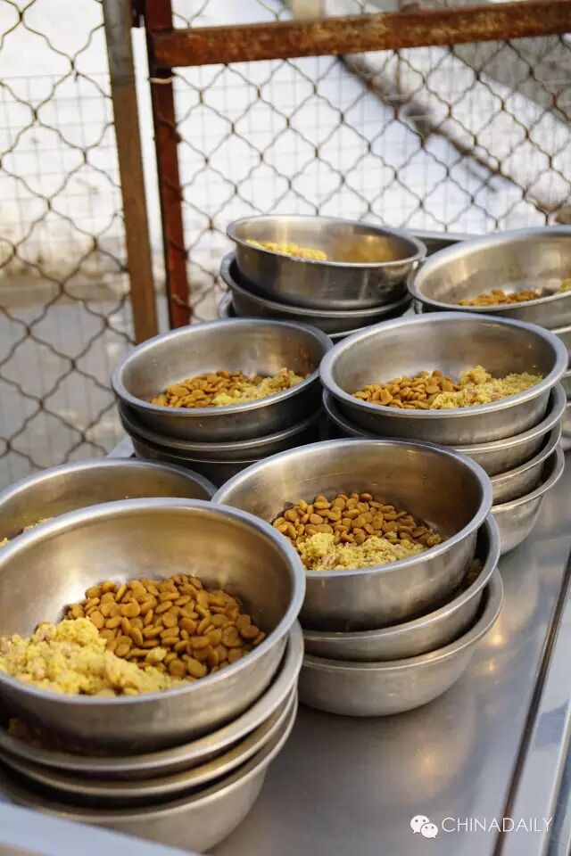 伙食是普通狗粮加玉米面和炖熟的鸡头,且从准备到喂食都由一位师傅操办。加上早上帮忙清扫的两个人,偌大的基地也不过只有四个工作人员。