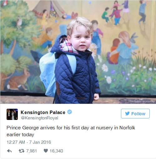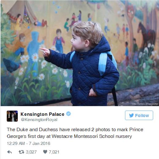 我们不仅想到当年威廉王子首次上学时备受关注的情景,大批记者和狗仔队,与之相比,他儿子第一天上学似乎粉丝参与少了些。