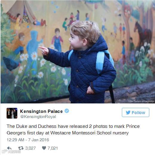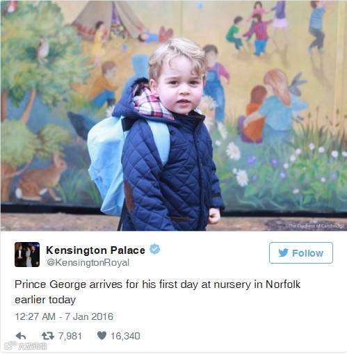 这个周三,一个穿着棉袄外套、背着淡蓝色书包的小朋友,开始了自己的求学之旅。而这个小朋友,也许有一天会成为国王哦。自从英国王室宣布小王子乔治这个月要上诺福克的西地蒙台梭利幼儿园的消息时,我们已经迫不及待的想要看到上幼儿园第一天小王子的照片。